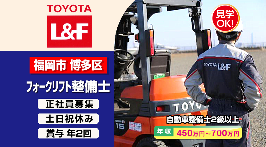 自動車整備士2級以上求人!年収450万円以上!福岡県 福岡市博多区東比恵 トヨタL&F福岡株式会社 転職採用情報!給料・環境・社会保険充実!