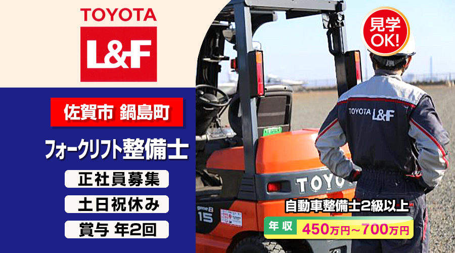 自動車整備士2級以上求人!年収450万円以上!佐賀県佐賀市鍋島町八戸 トヨタL&F福岡株式会社 転職採用情報!給料・環境・社会保険充実!
