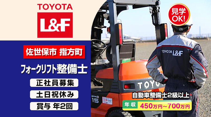 自動車整備士2級以上求人!年収450万円以上!長崎県佐世保市指方町 トヨタL&F福岡株式会社 転職採用情報!給料・環境・社会保険充実!