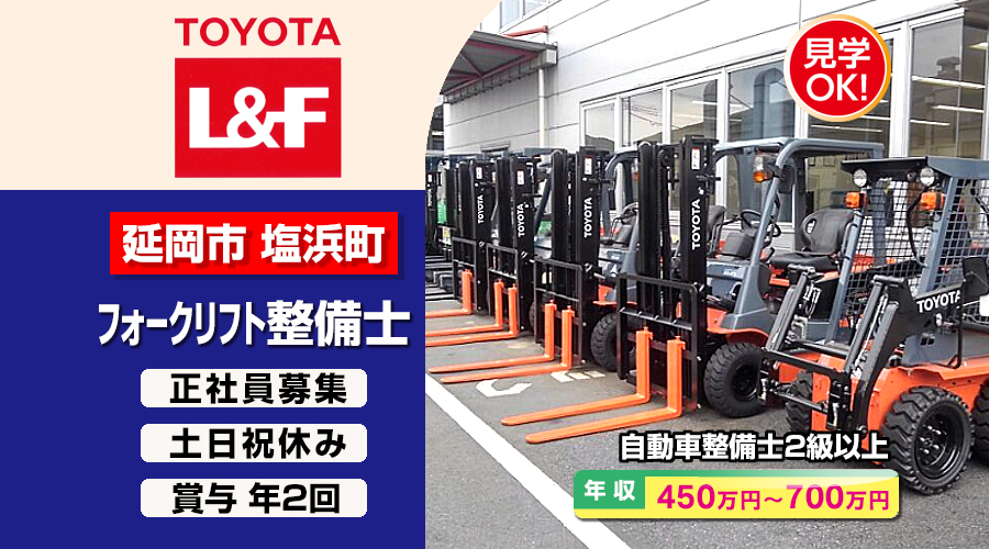 自動車整備士2級以上求人!年収450万円以上!宮崎県延岡市塩浜町 トヨタL&F宮崎株式会社 転職採用情報!給料・環境・社会保険充実!