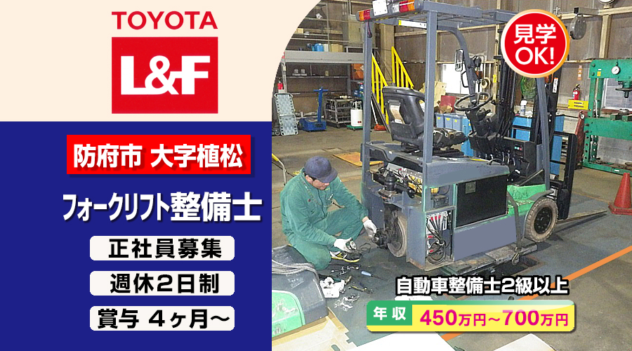 自動車整備士2級以上求人!年収450万円以上!山口県防府市大字植松 トヨタL&F山口株式会社 転職採用情報!給料・環境・社会保険充実!