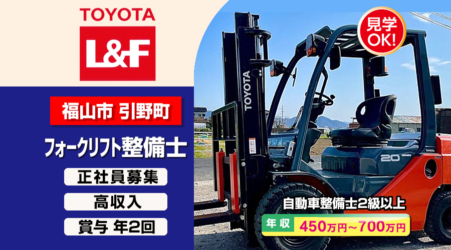 自動車整備士2級以上求人!年収450万円以上!広島県福山市引野町 トヨタL&F広島株式会社 転職採用情報!給料・環境・社会保険充実!