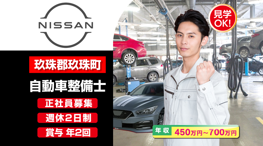 自動車整備士2級以上求人!年収450万円以上!大分県玖珠郡玖珠町大隈 日産プリンス大分販売株式会社 転職採用情報!給料・環境・社会保険充実!