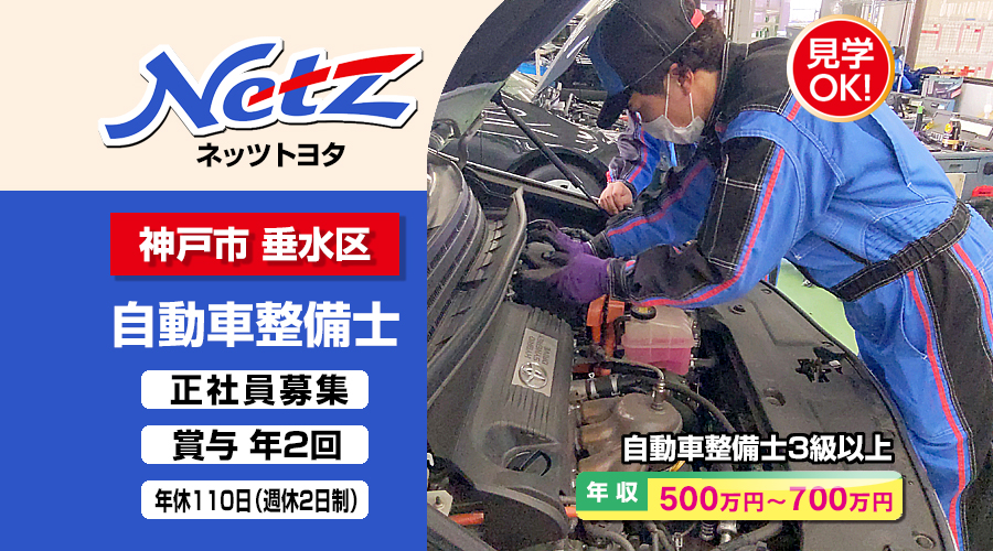自動車整備士3級以上求人!年収500万円以上!兵庫県神戸市垂水区名谷町 ネッツトヨタ兵庫株式会社 転職採用情報!働きながらでも転職サポート致します。