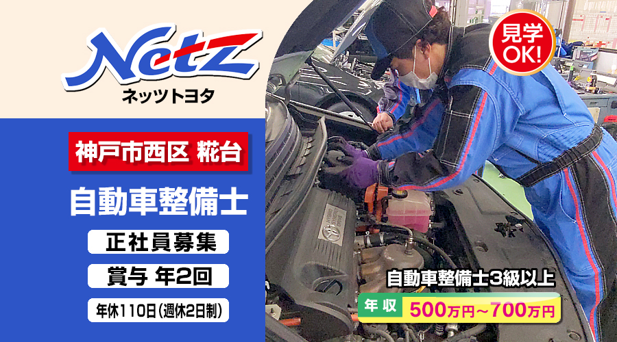 自動車整備士3級以上求人!年収500万円以上!兵庫県神戸市西区糀台 ネッツトヨタ兵庫株式会社 転職採用情報!働きながらでも転職サポート致します。