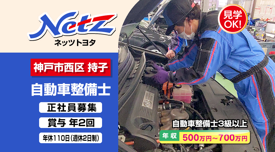 自動車整備士3級以上求人!年収500万円以上!兵庫県神戸市西区持子 ネッツトヨタ兵庫株式会社 転職採用情報!働きながらでも転職サポート致します。