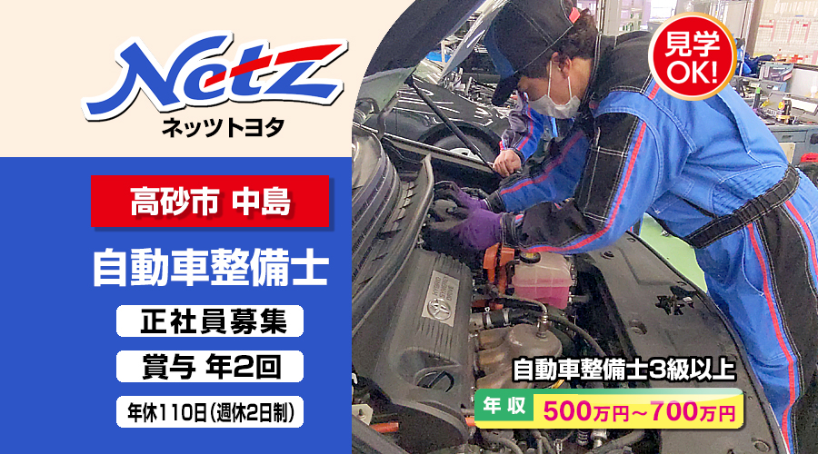 自動車整備士3級以上求人!年収500万円以上!兵庫県高砂市中島 ネッツトヨタ兵庫株式会社 転職採用情報!働きながらでも転職サポート致します。