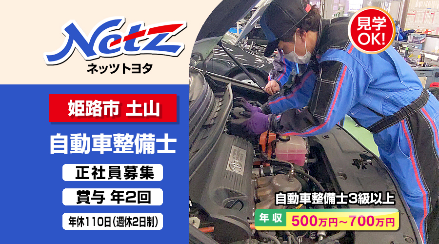 自動車整備士3級以上求人!年収500万円以上!兵庫県姫路市土山 ネッツトヨタ兵庫株式会社 転職採用情報!働きながらでも転職サポート致します。