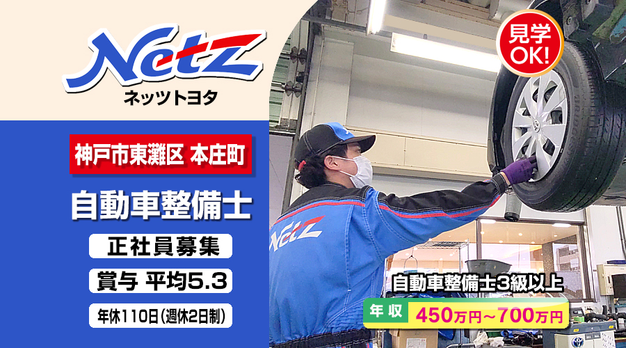 自動車整備士3級以上求人!年収450万円以上!兵庫県神戸市東灘区本庄町 ネッツトヨタ神戸株式会社 転職採用情報!働きながらでも転職サポート致します。