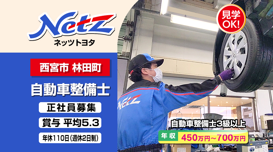 自動車整備士3級以上求人!年収450万円以上!兵庫県西宮市林田町 ネッツトヨタ神戸株式会社 転職採用情報!働きながらでも転職サポート致します。