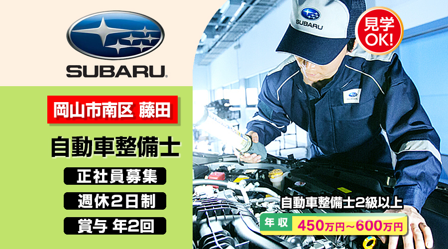自動車整備士2級以上求人!年収450万円以上!岡山県岡山市南区藤田 岡山スバル株式会社 転職採用情報!働きながらでも転職サポート致します。
