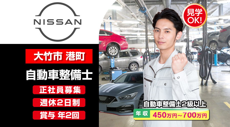 自動車整備士2級以上求人!年収450万円以上!広島県大竹市港町 日産プリンス広島販売株式会社 転職採用情報!働きながらでも転職サポート致します。