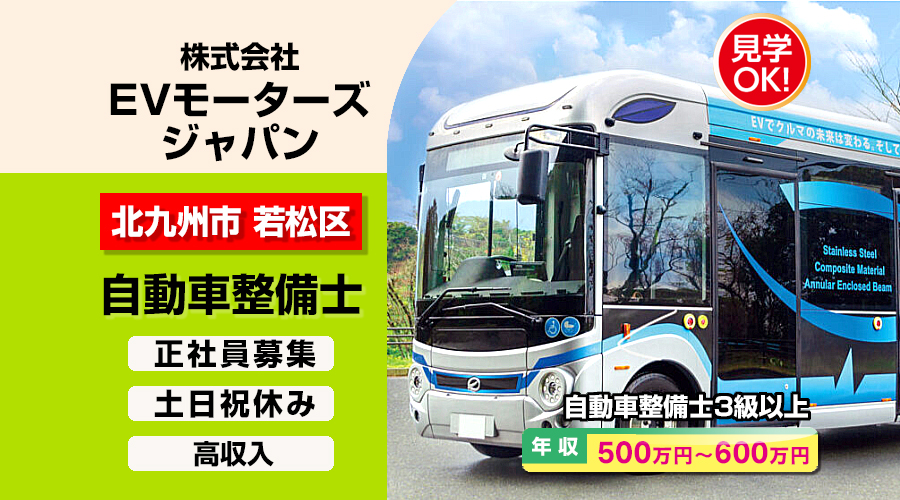 自動車整備士3級以上求人!年収500万円以上!福岡県北九州市若松区向洋町 株式会社 EVモーターズ・ジャパン へ 転職採用情報!