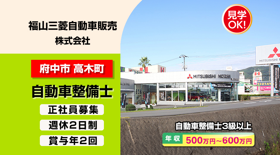 自動車整備士3級以上求人!年収500万円以上!広島県府中市高木町 福山三菱自動車販売株式会社 転職採用情報!
