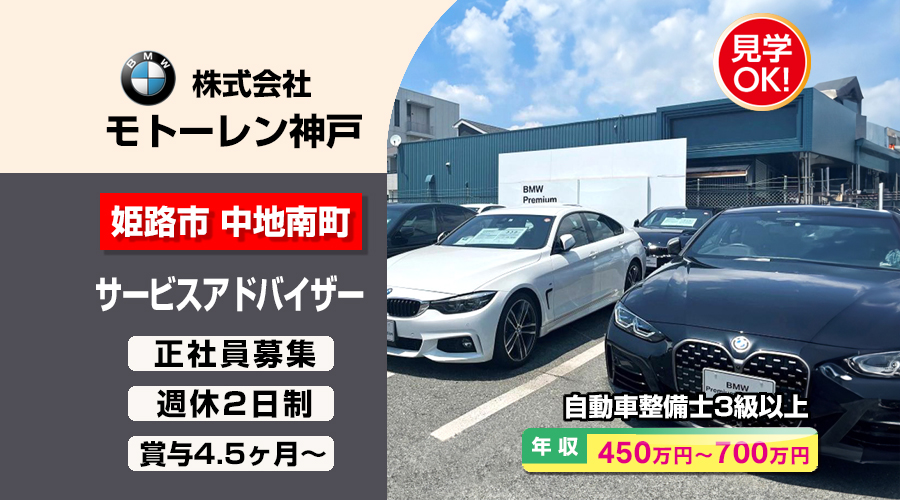 自動車整備士3級以上求人!年収450万円以上!兵庫県姫路市中地南町 株式会社モトーレン神戸 転職採用情報!