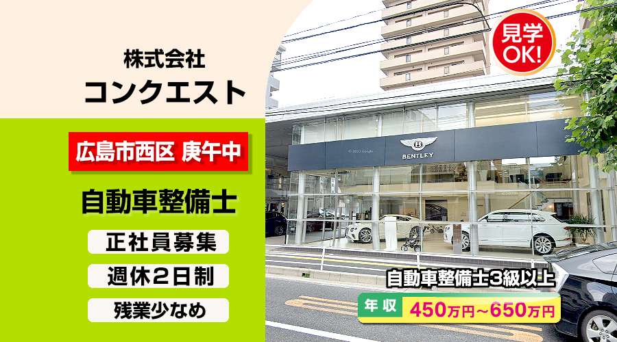 自動車整備士3級以上求人!年収450万円以上!広島県広島市西区 株式会社コンクエスト(ベントレー広島)転職採用情報!