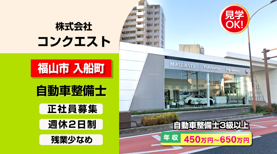 自動車整備士3級以上求人!年収450万円以上!広島県福山市入船町 株式会社コンクエスト(マセラッティ福山)転職採用情報!
