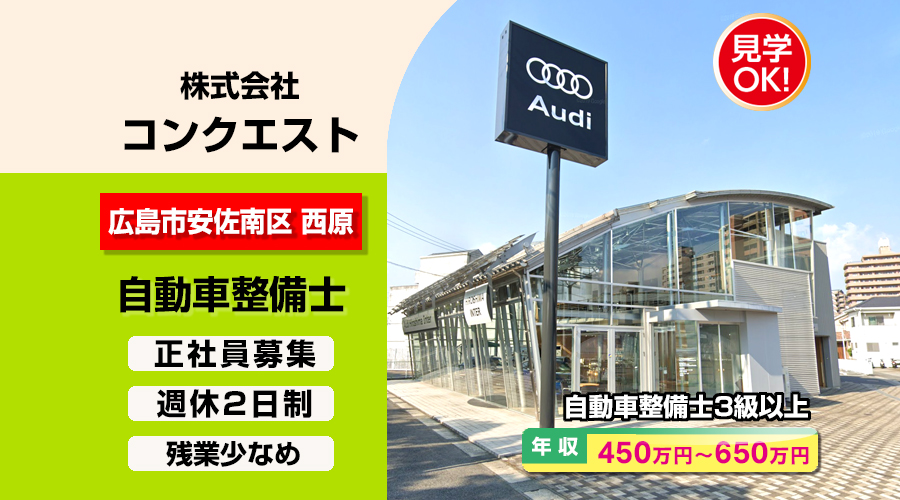 自動車整備士3級以上求人!年収450万円以上!広島県広島市安佐南区 株式会社コンクエスト(アウディ)転職採用情報!