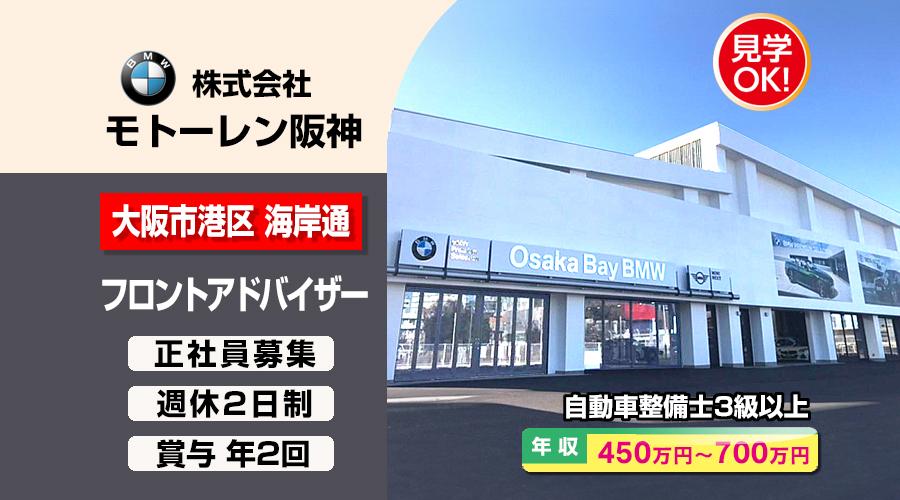 自動車整備士3級以上求人!年収450万円以上!大阪府大阪市港区海岸通 株式会社モトーレン阪神(BMW)転職採用情報!