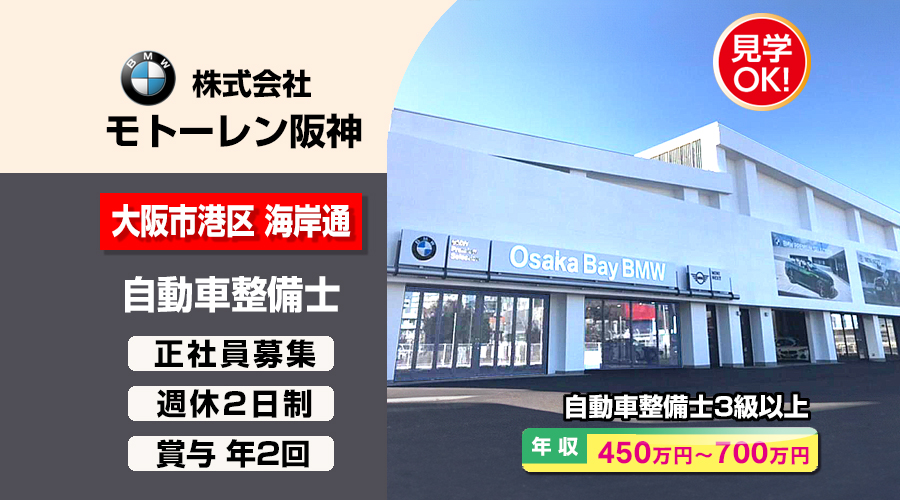 自動車整備士3級以上求人!年収450万円以上!大阪府大阪市港区海岸通 株式会社モトーレン阪神(BMW)転職採用情報!