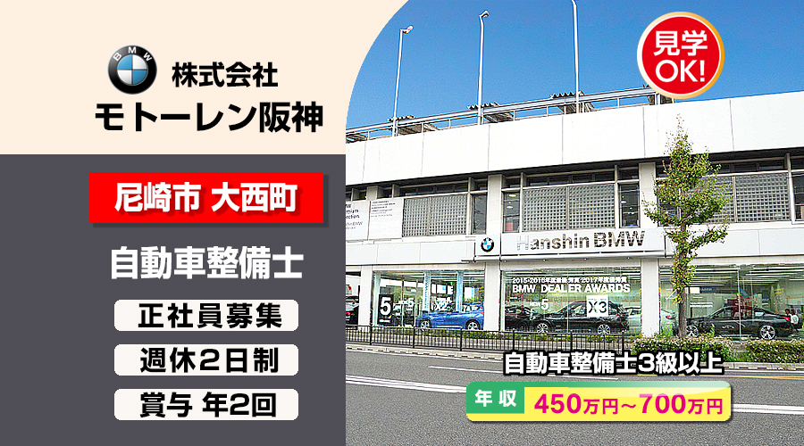 自動車整備士3級以上求人!年収450万円以上!兵庫県尼崎市大西町 株式会社モトーレン阪神(BMW)転職採用情報!