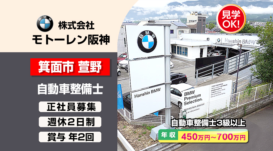 自動車整備士3級以上求人!年収450万円以上!大阪府箕面市萱野 株式会社モトーレン阪神(BMW)転職採用情報!