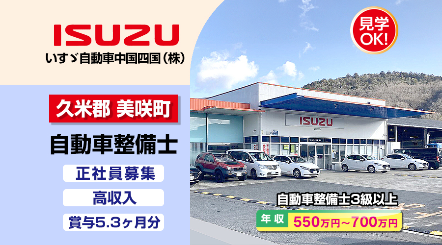 自動車整備士3級以上求人!年収550万円以上!岡山県久米郡美咲町 いすゞ自動車中国四国株式会社 転職採用情報!高収入・日祝休み