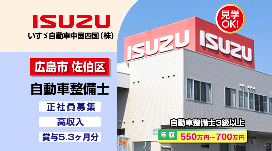 自動車整備士3級以上求人!年収550万円以上!広島県広島市佐伯区 いすゞ自動車中国四国株式会社 転職採用情報!高収入・日祝休み