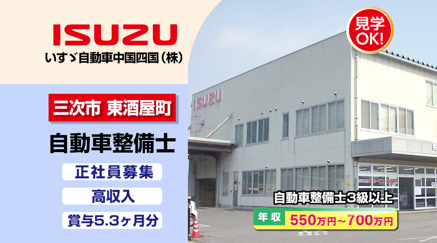 自動車整備士3級以上求人!年収550万円以上!広島県三次市東酒屋町 いすゞ自動車中国四国株式会社 転職採用情報!高収入・日祝休み