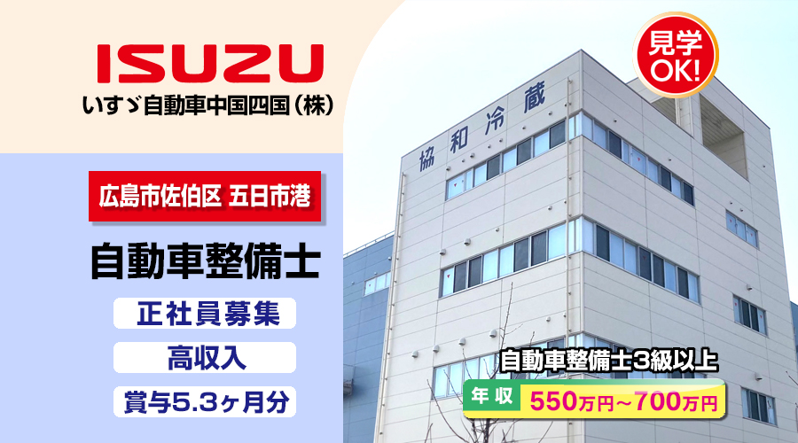 自動車整備士3級以上求人!年収550万円以上!広島県広島市佐伯区五日市 いすゞ自動車中国四国株式会社 転職採用情報!高収入・日祝休み