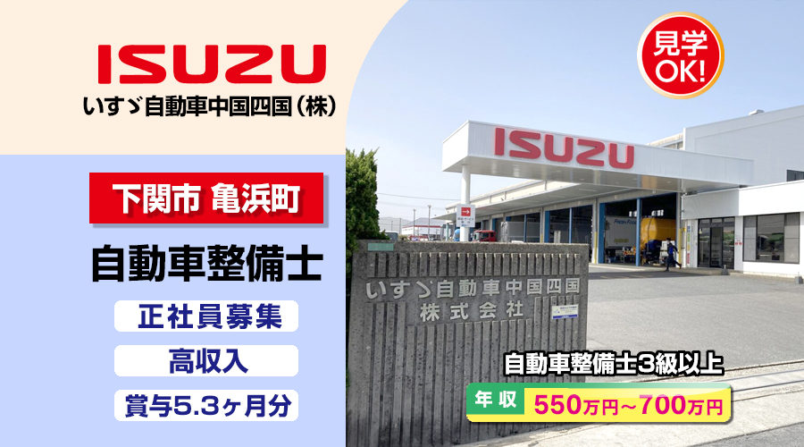 自動車整備士3級以上求人!年収550万円以上!山口県下関市亀浜町 いすゞ自動車中国四国株式会社 転職採用情報!高収入・日祝休み