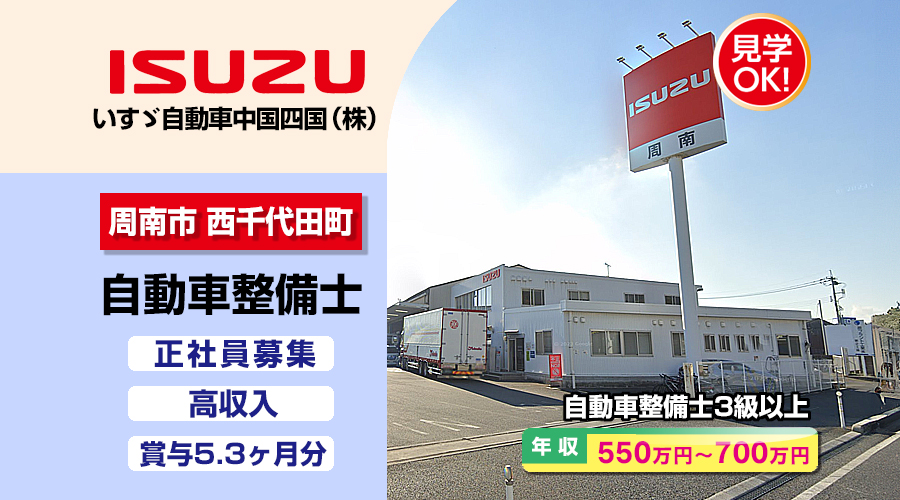 自動車整備士3級以上求人!年収550万円以上!山口県周南市西千代田町 いすゞ自動車中国四国株式会社 転職採用情報!高収入・日祝休み