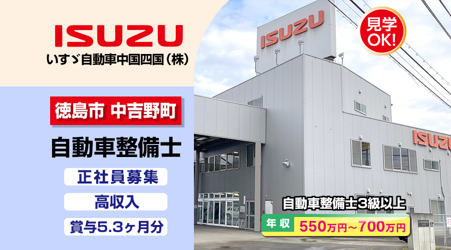 自動車整備士3級以上求人!年収550万円以上!徳島県徳島市中吉野町 いすゞ自動車中国四国株式会社 転職採用情報!高収入・日祝休み