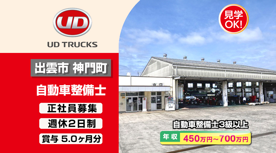 自動車整備士3級以上求人!年収450万円以上!島根県出雲市神門町 UDトラックス株式会社 転職採用情報!在職中の方でもエージェントが転職をサポート致します。