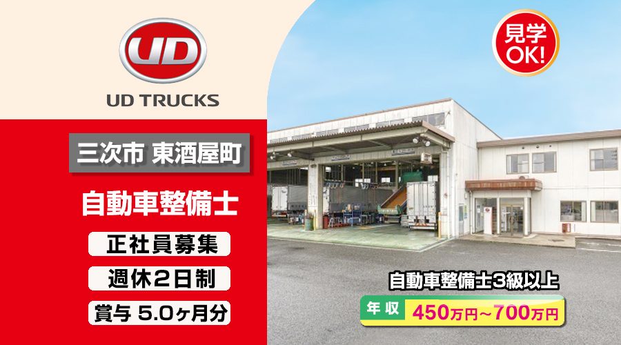 自動車整備士3級以上求人!年収450万円以上!広島県三次市東酒屋町 UDトラックス株式会社 転職採用情報!在職中の方でもエージェントが転職をサポート致します。