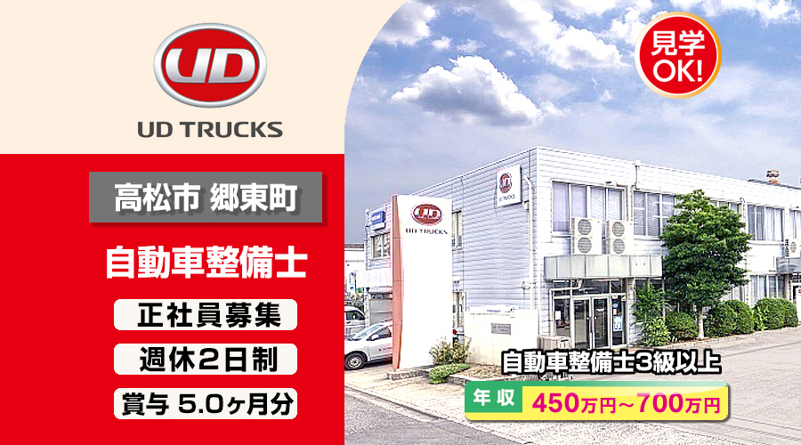 自動車整備士3級以上求人!年収450万円以上!香川県高松市郷東町 UDトラックス株式会社 転職採用情報!在職中の方でもエージェントが転職をサポート致します。