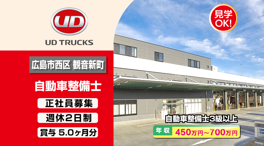 自動車整備士3級以上求人!年収450万円以上!広島県広島市西区観音新町 UDトラックス株式会社 転職採用情報!在職中の方でもエージェントが転職をサポート致します。
