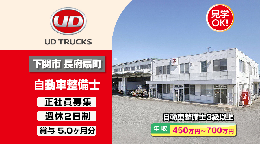 自動車整備士3級以上求人!年収450万円以上!山口県下関市長府扇町 UDトラックス株式会社 転職採用情報!在職中の方でもエージェントが転職をサポート致します。