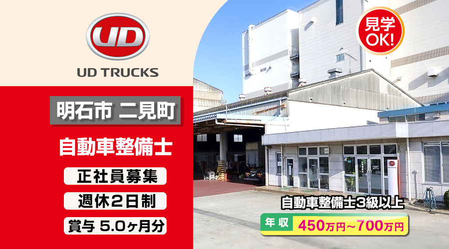 自動車整備士3級以上求人!年収450万円以上!兵庫県明石市二見町 UDトラックス株式会社 転職採用情報!在職中の方でもエージェントが転職をサポート致します。