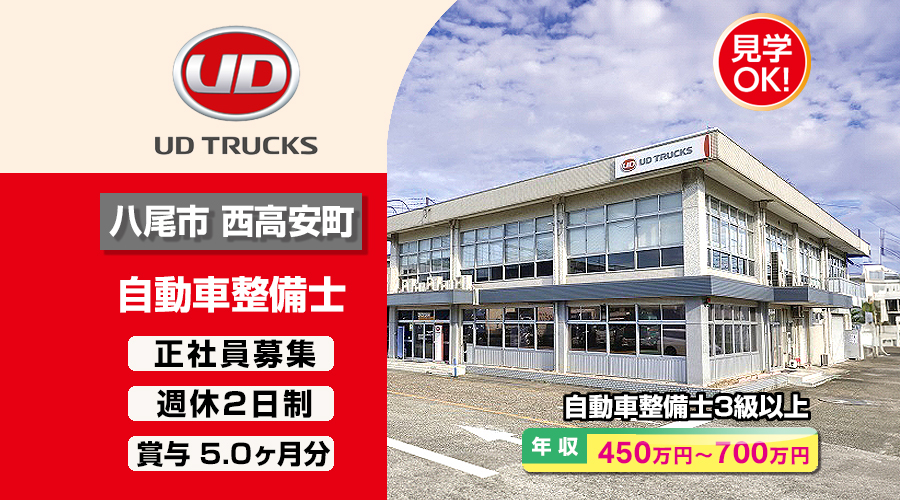 自動車整備士3級以上求人!年収450万円以上!大阪府八尾市西高安町 UDトラックス株式会社 転職採用情報!在職中の方でもエージェントが転職をサポート致します。