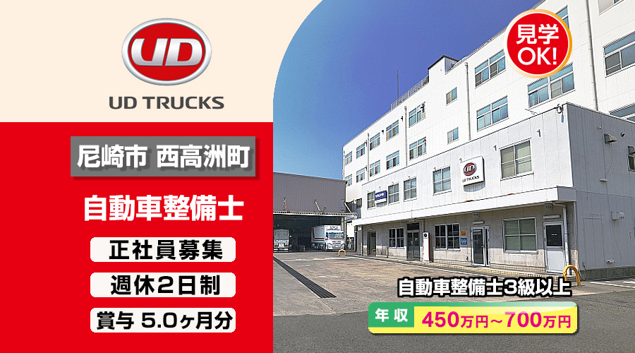 自動車整備士3級以上求人!年収450万円以上!兵庫県尼崎市西高洲町 UDトラックス株式会社 転職採用情報!在職中の方でもエージェントが転職をサポート致します。