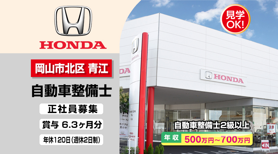 株式会社ホンダモビリティ中四国 (ホンダカーズ岡山 青江店)【ホンダモビリティ中四国】 自動車整備士・メカニック(岡山市北区青江)