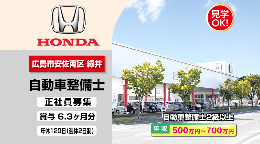 自動車整備士2級以上求人!年収500万円以上!広島県広島市安佐南区 株式会社ホンダモビリティ中四国 転職採用情報!在職中の方でもエージェントが転職をサポート致します。