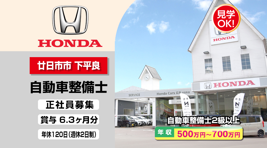 自動車整備士2級以上求人!年収500万円以上!広島県廿日市市下平良 株式会社ホンダモビリティ中四国 転職採用情報!在職中の方でもエージェントが転職をサポート致します。