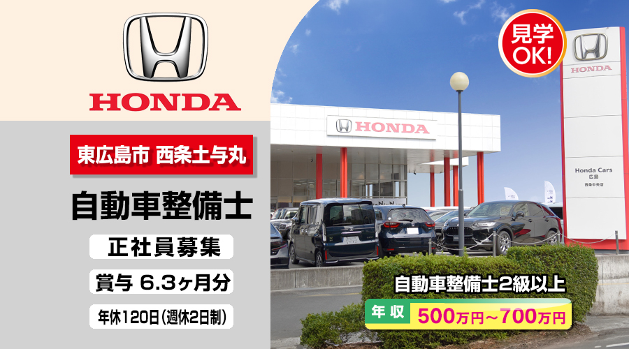 株式会社ホンダモビリティ中四国 (ホンダカーズ広島 西条中央店)【ホンダモビリティ中四国】 自動車整備士・メカニック(東広島市西条土与丸)