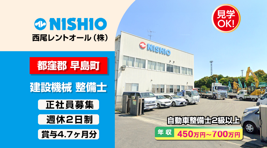 自動車整備士2級以上求人!年収450万円以上!岡山県都窪郡早島町 西尾レントオール株式会社 転職採用情報!キャリアアップ転職をサポート致します。