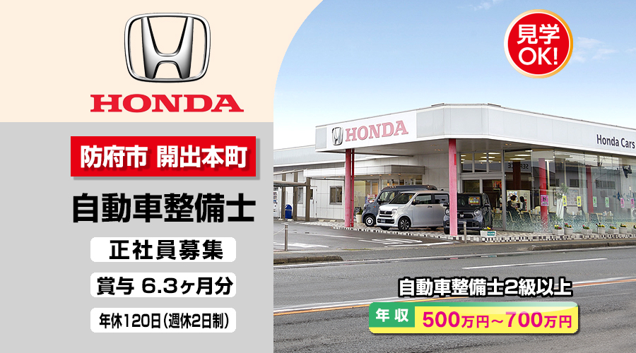 自動車整備士2級以上求人!年収500万円以上!山口県防府市開出本町 株式会社ホンダモビリティ中四国 転職採用情報!働きながらでも転職サポート致します。