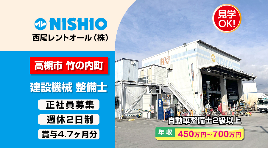 自動車整備士2級以上求人!年収450万円以上!大阪府高槻市竹の内町 西尾レントオール株式会社 転職採用情報!キャリアアップ転職をサポート致します。