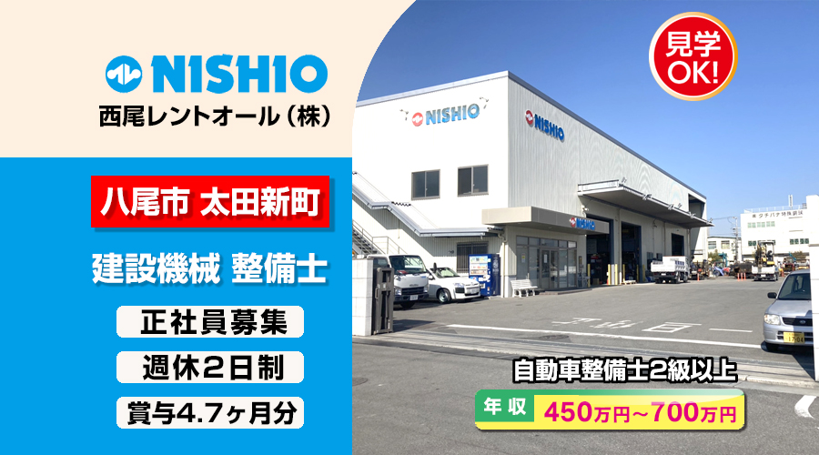 自動車整備士2級以上求人!年収450万円以上!大阪府八尾市太田新町 西尾レントオール株式会社 転職採用情報!キャリアアップ転職をサポート致します。
