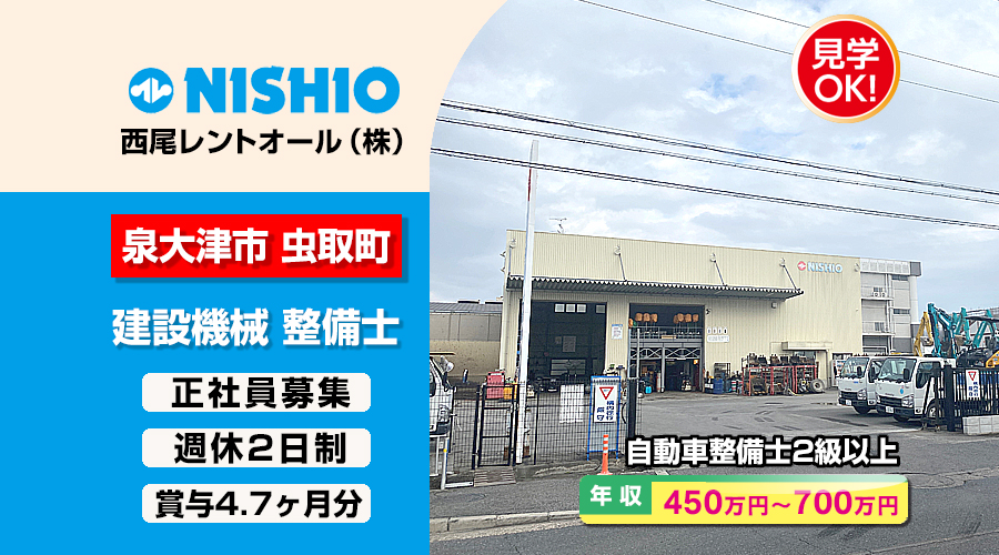 西尾レントオール株式会社 (泉大津営業所)【西尾レントオール】 建設機械 整備士(泉大津市虫取町)